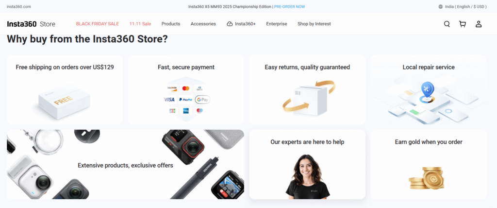 Head over to Insta360 and browse through their wide range of products — including Insta360 X4, ONE RS, GO 3, and Flow Gimbal. Add your desired items to the shopping cart.