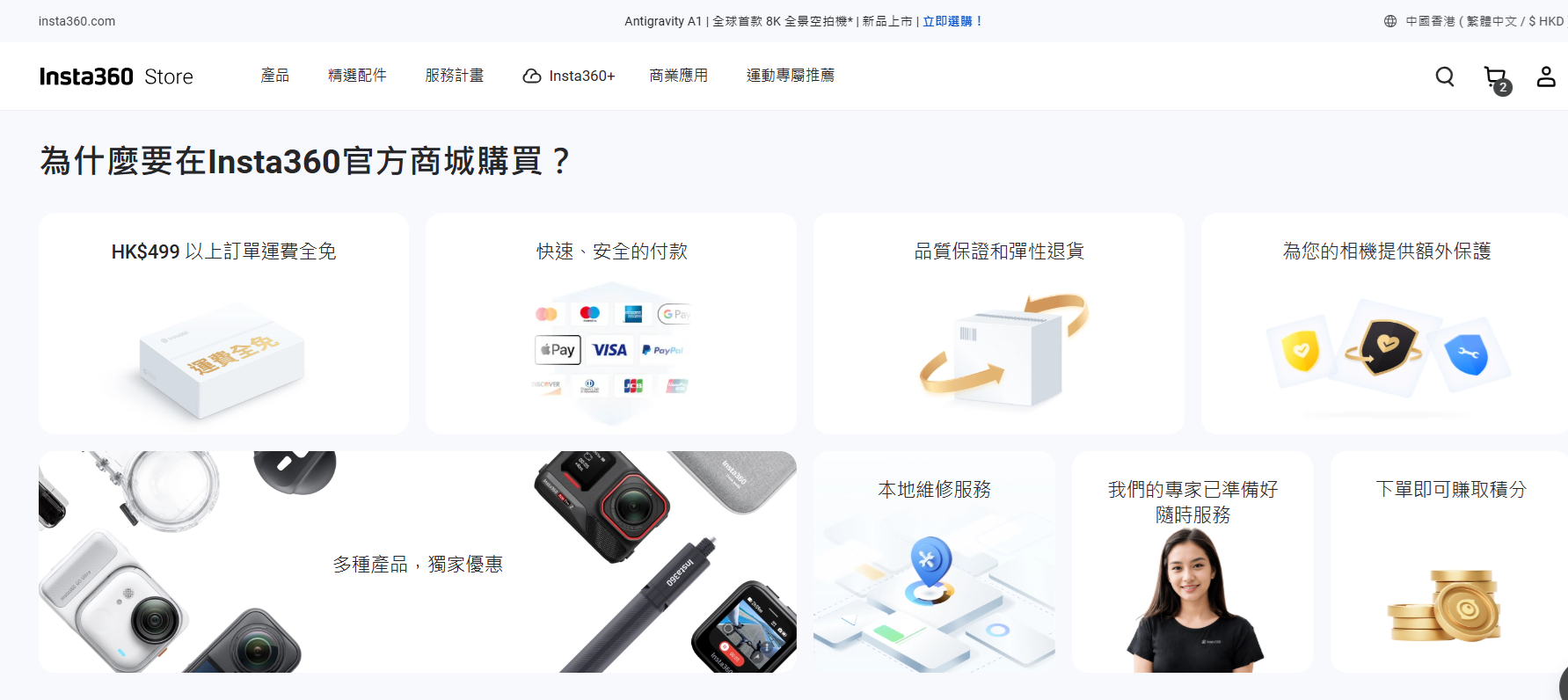 進入 Insta360 官方網站,瀏覽多樣化產品,如 Insta360 X4、ONE RS、GO 3、Flow 穩定器等,並加入購物車。